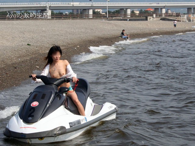 ジェットスキーで海辺を露出暴走!釣り客のおじさん、見て見て〜♪