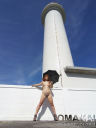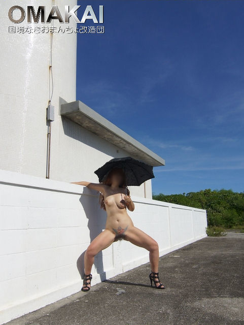 ・コメントマッパに日傘! 南の島の灯台で撮影しました。 Milkの足元には、自分で作った水たまり〜! 何食わぬ顔でポーズをとるMilkでした。^^