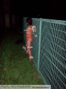 深夜の運動公園のフェンスに手首、肘、旨、腰、膝、足首を