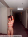 その後、乳首とアソコに鈴の付いた洗濯バサミを噛ませて、廊下へ連れ出しました。