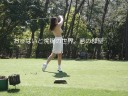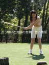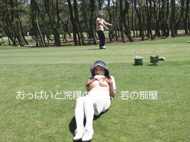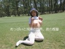 上半身裸でゴルフです。スイングするたび胸が左右に振れています。