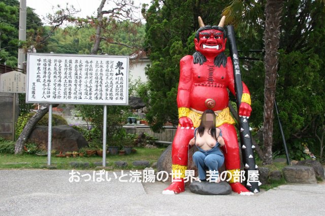 温泉地の○○地獄でおっぱい出して、タヌキのを触ってます。